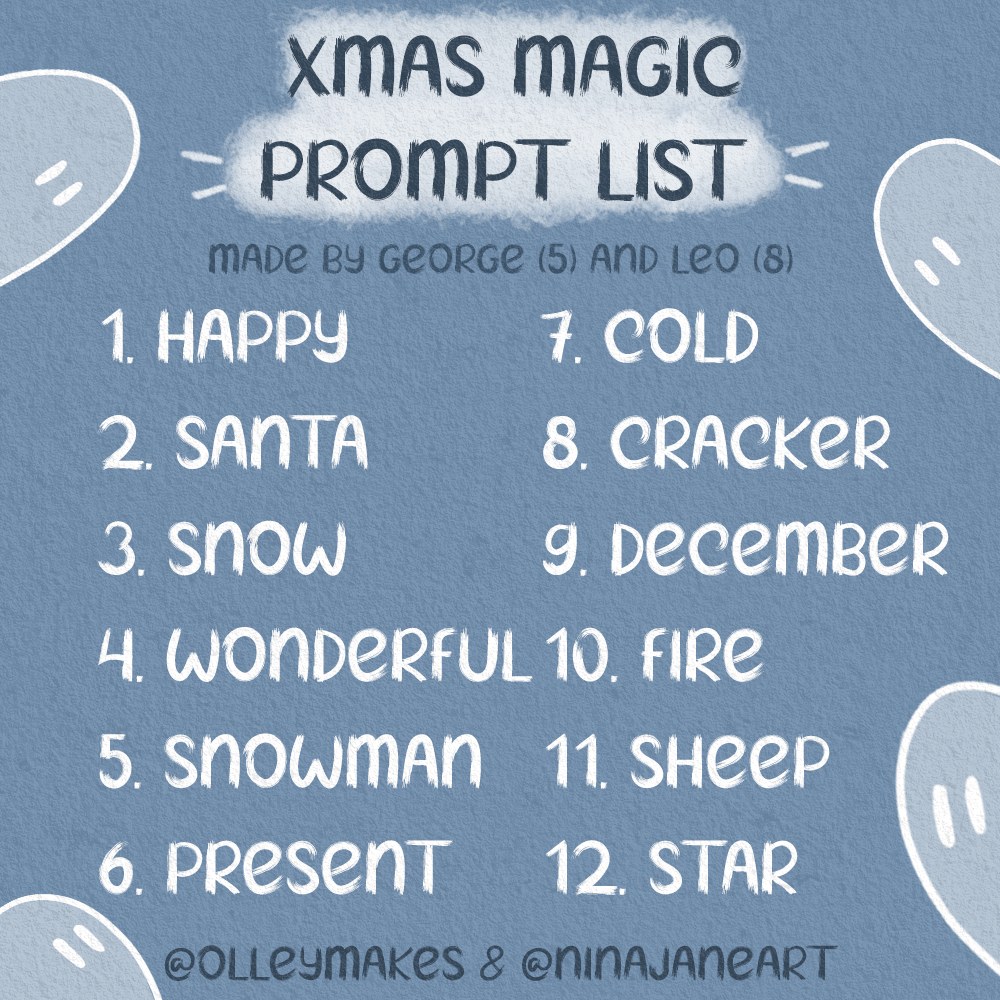 Starting tomorrow I will be participating in an art challenge hosted by my favorite Art streamer on Twitch @NinaJaneArt. The challenge consists of 12 different prompts, words that the children of one of her friends and fellow streamers came up with when asked about Christmas and New Years.