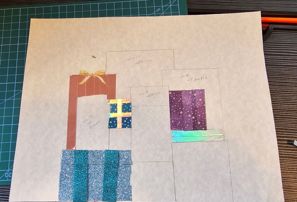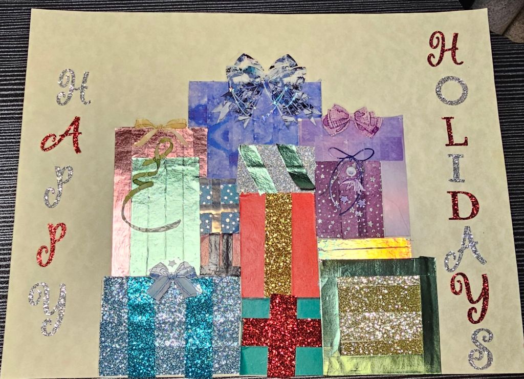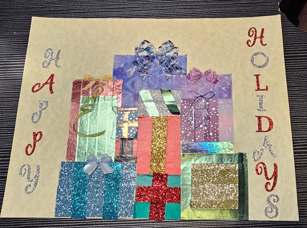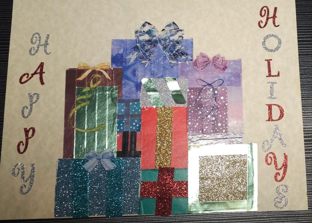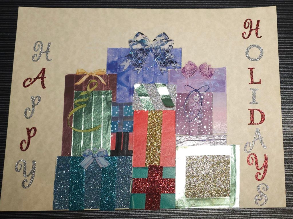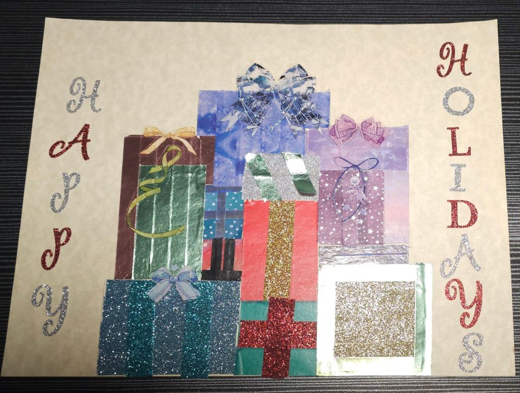 For this prompt I decided to work with washi tape, PET stickers, and regular stickers. I took a nice heavy piece of paper and sketched out a pile of presents. I cut out bows from some different PET tapes that I have to create stickers. I decided which of the presents those sticker would go on and decorated the boxes accordingly. To decorate the boxes I used a variety of washi tape. Creating each present in the pile brought joy but also reminded me of the time and effort it takes to wrap actual gifts. I probably spent as much time on these 2D gifts as I do wrapping real ones.