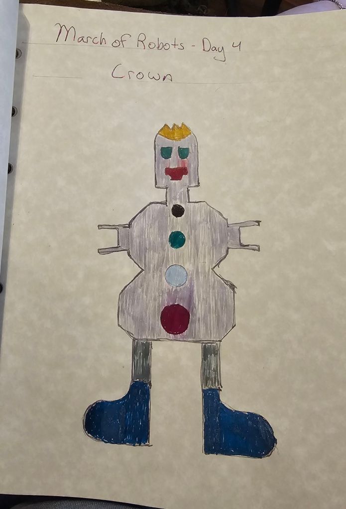 For Crown, I drew this using stencils much like the other pieces for this challenge. I tried to have fun but ultimately it’s a very silly looking robot with a crown on his head. It’s not my favorite.