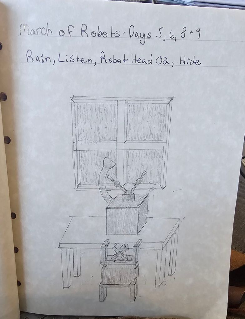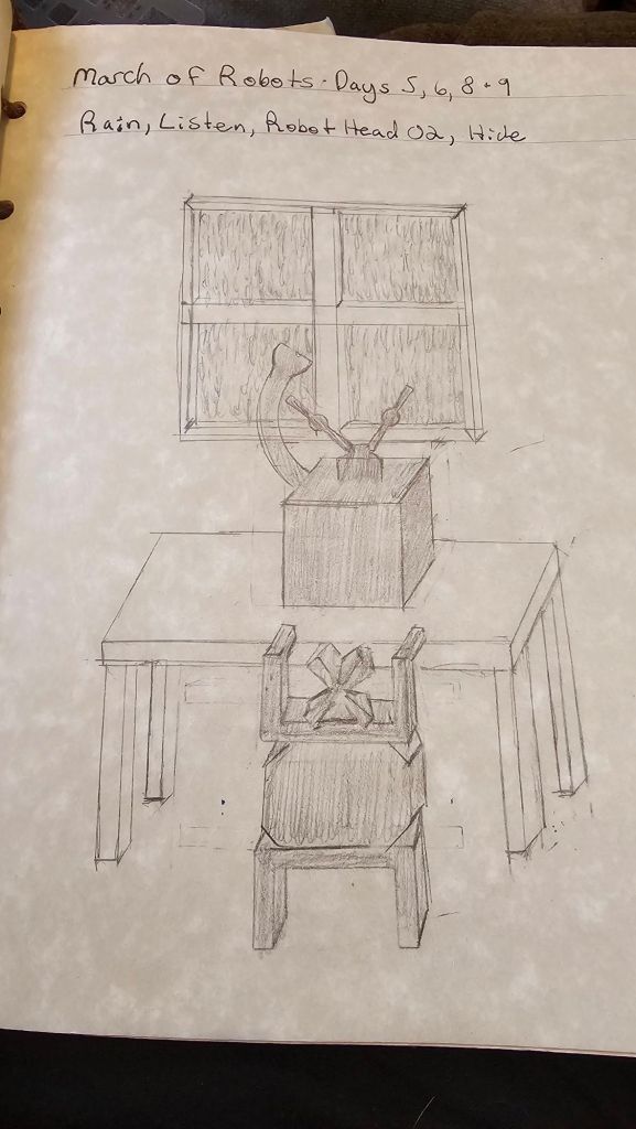 This one is a pencil sketch. I feel more proud of this one because while I did use some stencils, I also did a lot of perspective work to create a picture in dimensional space. I haven’t don that for some time. It was fun to get back to it and it’s still something I am comfortable with because I’m still using straight edges to ensure my lines are clean. The idea here is the little robot is afraid of the storm so he is hiding under the table while his head stays out and listens for the rain to stop.